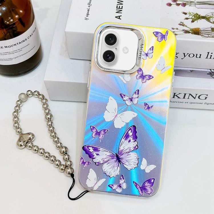 Estuche para Teléfono iPhone 16 Mariposa Láser Galvanoplastia con Correa para Muñeca (Moradas Blancas)