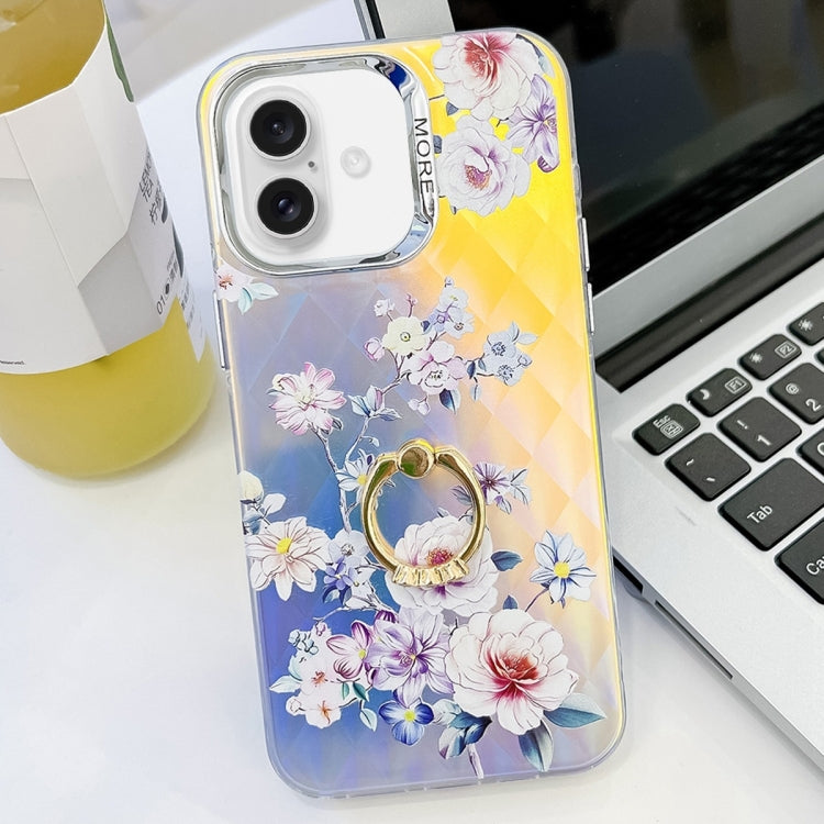 Caja de Teléfono TPU para iPhone 16 con Soporte de Anillo y Flor Láser de Galvanoplastia (Flor Ah6)