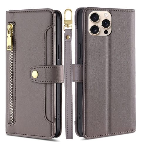 Funda de Cuero Tipo Billetera con Cremallera Diseño Cruzado Textura Oveja para iPhone 16 Pro (Gris)