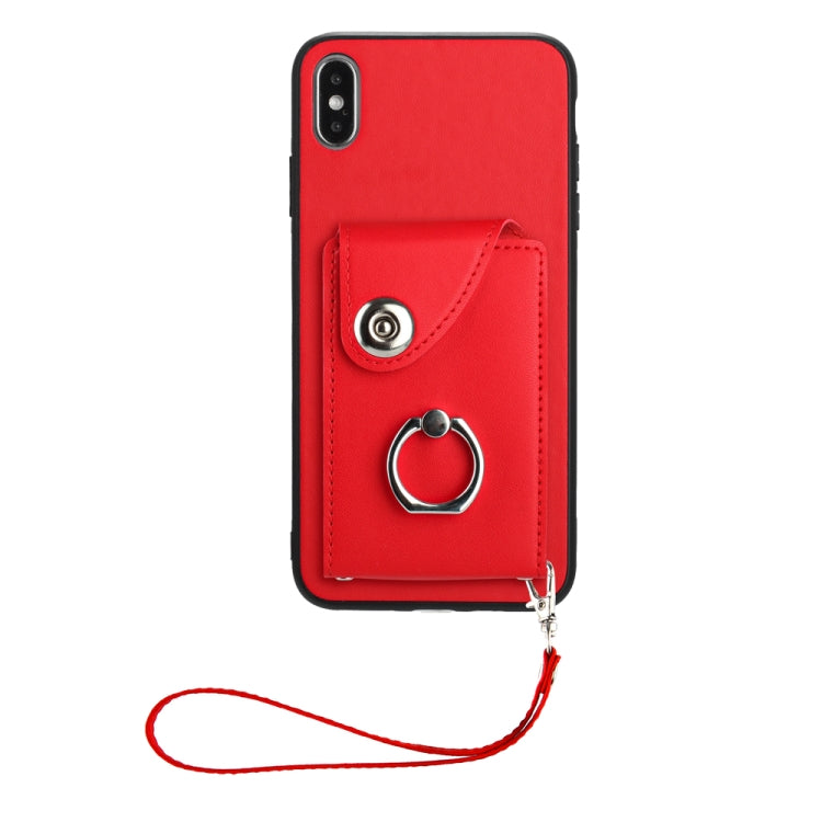 Funda para teléfono iPhone Xs Max de PU con soporte para anillo y bolsa para tarjeta con cordón (Rojo)