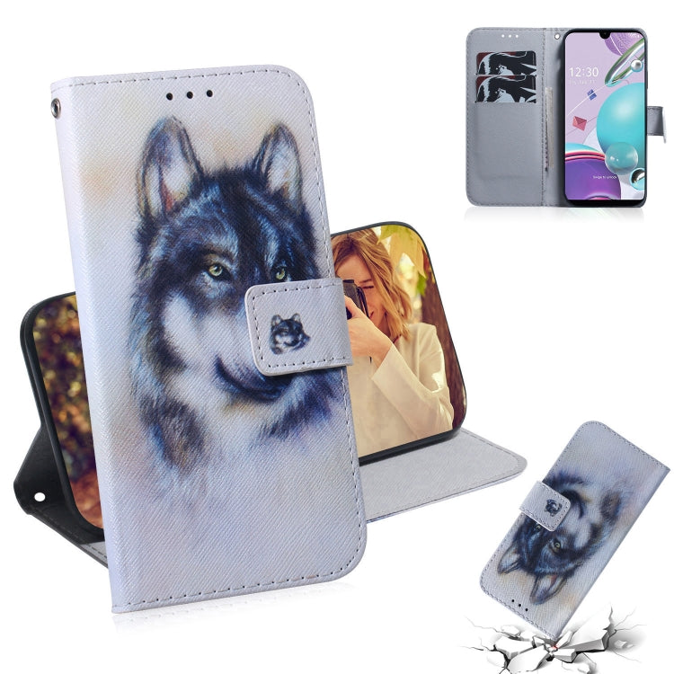 Funda de Cuero Abatible Horizontal para LG Q52 con Dibujo 3D, Soporte, Ranuras y Cordón (Flor de Acuarela)