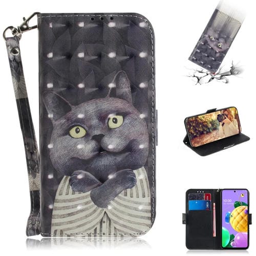 Funda de Cuero Abatible Horizontal para LG K62 K52 Q52 con Dibujo 3D, Soporte, Ranuras y Cordón (Hug Cat)