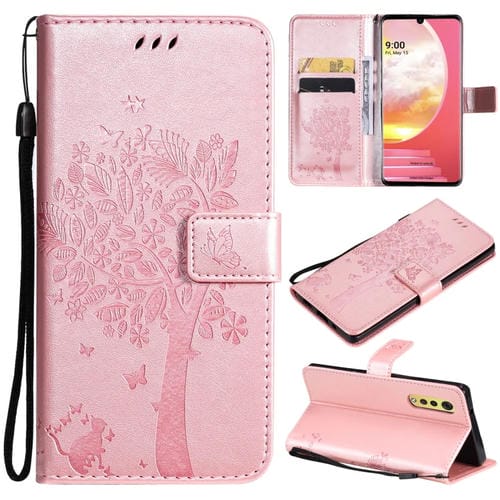 Funda de Cuero PU con Soporte y Tarjetero para LG Velvet 2 Pro (Oro Rosa) con Patrón Árbol y Gato