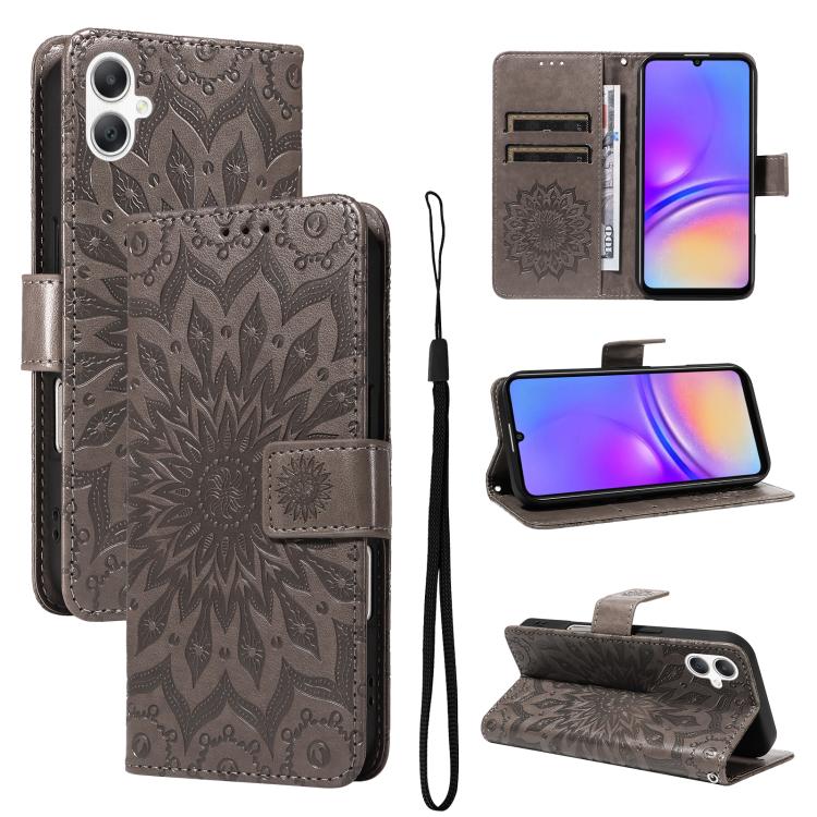 Funda de cuero con tapa y estampado de girasoles en relieve para Samsung Galaxy A07 5G (gris)