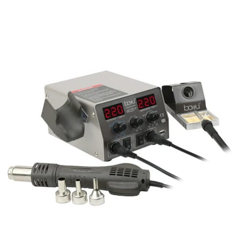 La estación de soldadura Digital Baku BA-602D es una Herramienta profesional diseñada para la Reparación de Teléfonos Móviles y otros dispositivos electrónicos. Este modelo cuenta con una Pantalla Digital dual que permite controlar con precisión la temperatura de trabajo, facilitando la soldadura de Componentes electrónicos sensibles. Compatible con voltajes de entrada de 110/220 V, ofrece un rango de temperatura ajustable entre 200 y 480 grados Celsius, adaptándose a distintas necesidades de soldadura. Su estructura combina una plancha eléctrica con mango de plástico, proporcionando un manejo seguro y ergonómico. La estación está equipada con una punta de cautín estándar y opera mediante conducción eléctrica, ideal para usuarios que reparan por cuenta propia o Técnicos especializados en electrónica Móvil.