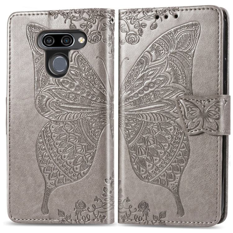 Funda de Cuero Butterfly Love Flowers para LG K50 con Tapa Horizontal, Soporte, Ranuras, Billetera y Cordón (Gris)