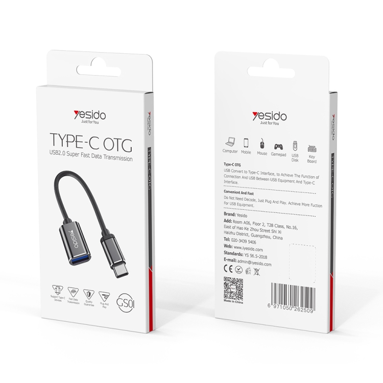Cable Convertidor Datos Yesido GS01 Tipo C a USB 2.0 OTG (Negro)