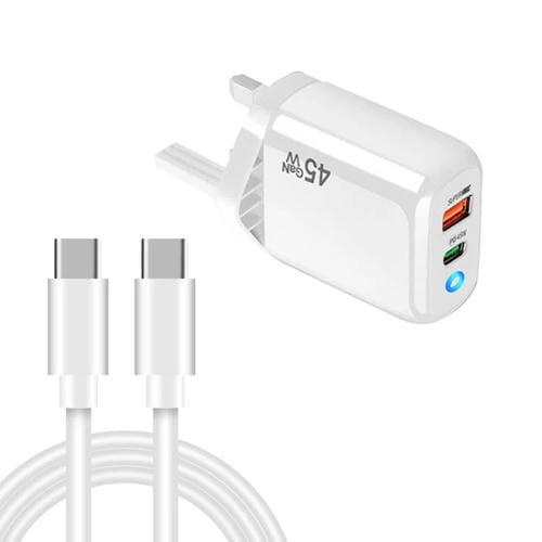 Cargador TE-PD45 GaN 45 W PD3.0/Tipo C + USB 3.0 con cable de datos tipo C a tipo C, enchufe británico (blanco)