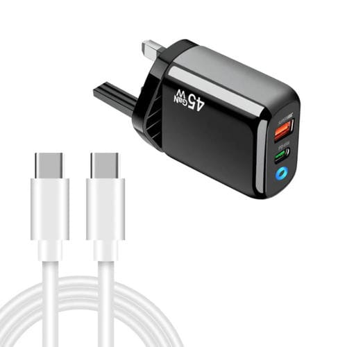 Cargador TE-PD45 GaN 45 W PD3.0/Tipo C + USB 3.0 con cable de datos tipo C a tipo C, enchufe británico (negro)