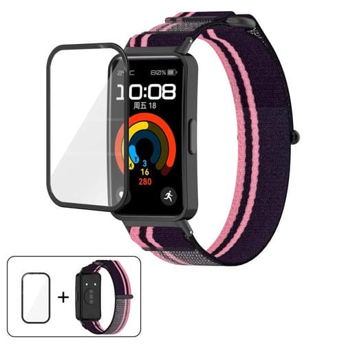 Correa de reloj de nailon con cierre de velcro y película curva 3D para Huawei Band 10/10 NFC Wild Path (rosa y morado)
