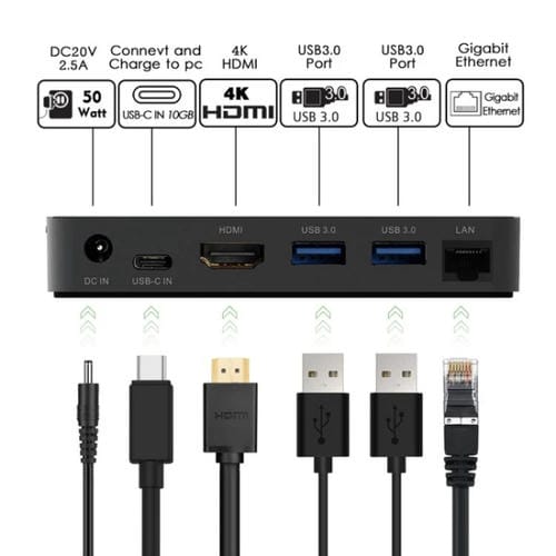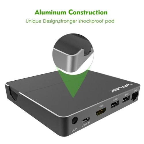 • Puertos: 1x HDMI 4K HD, 2x USB 3.0, 1x USB-C entrada, 1x Gigabit Ethernet, 1x DC; Adaptador de corriente de 36 W; Dimensiones: 115,5 x 110,5 x 19,5 mm; Peso: 255 g; Voltaje: 100-240 V; Temperatura de operación: 0 a 40 °C
