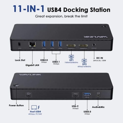 • Incluye 11 Puertos: DisplayPort 8K, DisplayPort 4K, USB 3.1-C de 10 Gbps, USB 3.1-A de 10 Gbps, USB 3.0-A de 5 Gbps, Puerto Gigabit Ethernet, Conector telefónico de 4 polos, ranura para candado y Carga PD IN de 130 W; Soporte para video 8K a 30Hz o dual 4K a 60Hz; transferencia de datos hasta 40 Gbps; Enchufe australiano