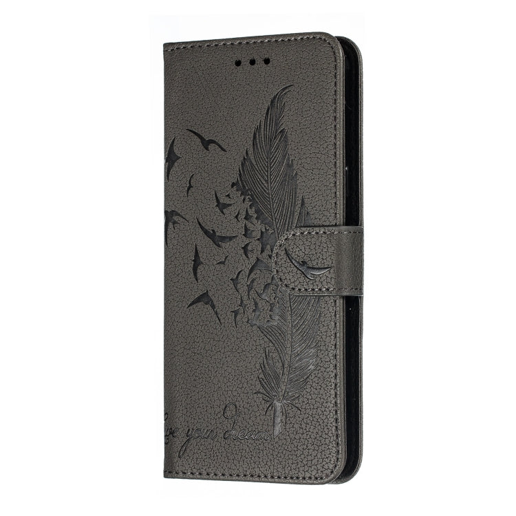 Estuche de Cuero con Tapa Horizontal para LG K50 con Textura Litchi, Patrón Plumas, Billetera y Ranuras (Gris)