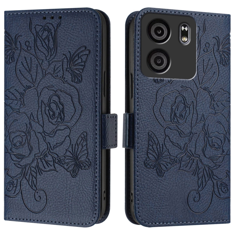 Funda de Cuero Antirrobo RFID para BLU View 5 con Diseño Rosa en Relieve (Azul Oscuro)