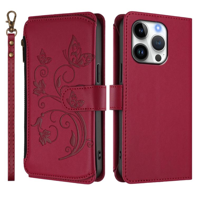 Funda de cuero con cremallera para iPhone 16 Pro, diseño de mariposas, flores y amor (rojo vino)