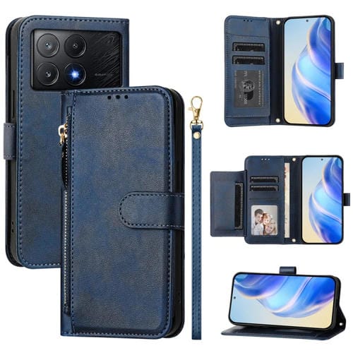 Funda de Cuero con Cremallera y Ranuras para Múltiples Tarjetas para Xiaomi Poco X6 Pro/Redmi K70E (Azul)