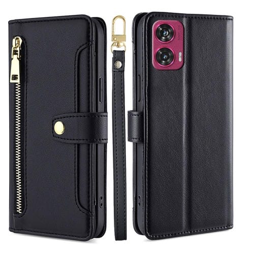 Funda de Cuero con Cremallera y Textura de Oveja para Motorola Edge 50 Fusion 5G (Negra)