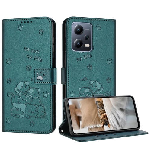 Funda de Cuero con Estampado de Gatito y Cordón para Redmi Note 12 Pro+ (Verde Oscuro)