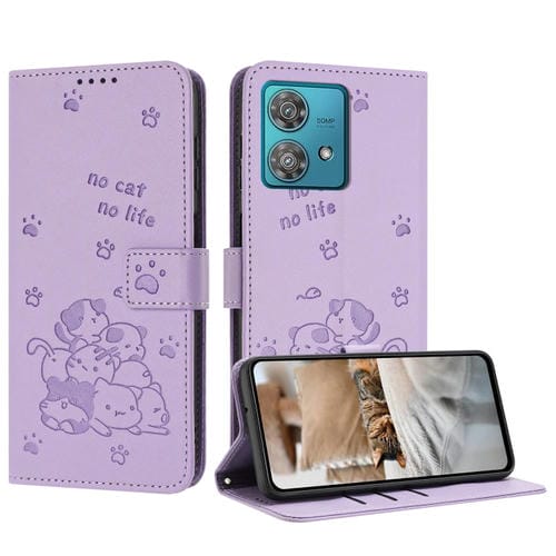 Funda de Cuero Motorola Edge 40 Neo con Diseño de Gatito en Relieve y Cordón (Morado)