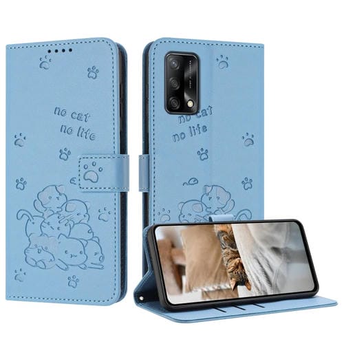 Funda de Piel con Diseño de Gatito En Relieve y Cordón para Oppo A74 4G / F19 / F19S (Azul)