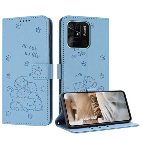Funda de Cuero con Diseño de Gatito En Relieve para Redmi 10C 4G Global con Cordón (Azul)
