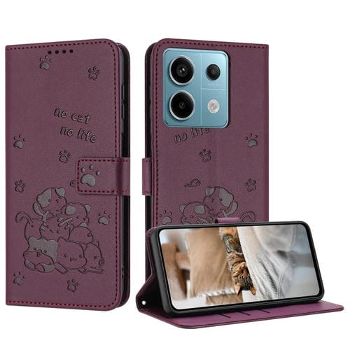 Funda de Cuero con Estampado de Gatito En Relieve para Redmi Note 13 5G con Cordón (Rojo Vino)