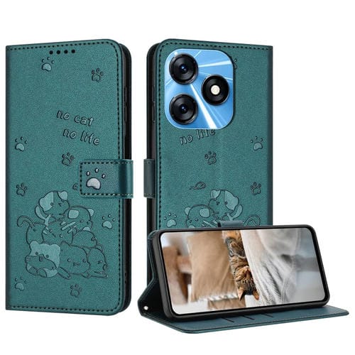 Funda de Cuero para Tecno Spark 10 4G y Spark 10C con Diseño de Gatito En Relieve y Cordón (Verde Oscuro)
