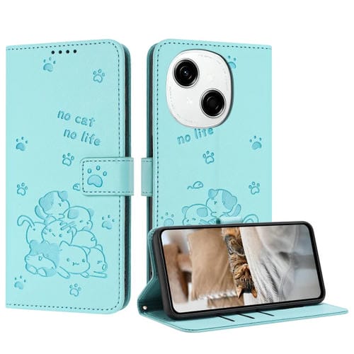 Funda de Cuero para Tecno Spark Go 1/Go 2025 con Diseño de Gatito En Relieve y Cordón (Verde Menta)