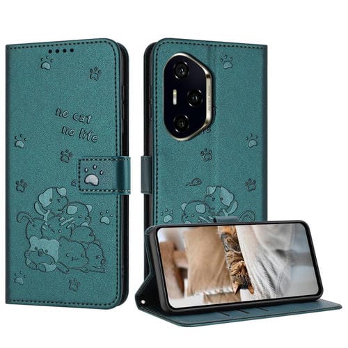 Funda de Cuero Honor 300 Pro con Diseño de Gatito en Relieve y Cordón (Verde Oscuro)