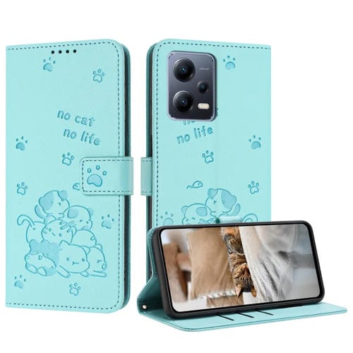 Funda de Piel con Diseño de Gatito En Relieve para Xiaomi Poco X5 Pro 5G con Cordón (Verde Menta)