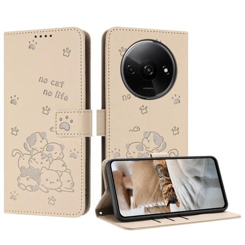 Funda de Piel con Diseño de Gatito En Relieve y Cordón para Redmi A3 4G Global / A3X 4G (Beige)