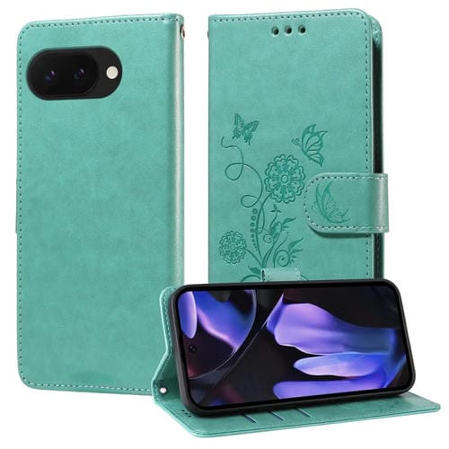Funda de Cuero para Google Pixel 9A con Diseño de Mariposas y Flores en Relieve (Verde)
