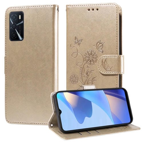 Funda de Cuero con Diseño de Mariposas y Flores En Relieve para Oppo A54 4G/A54S/A55 4G/5G/A53S 5G (Dorada)