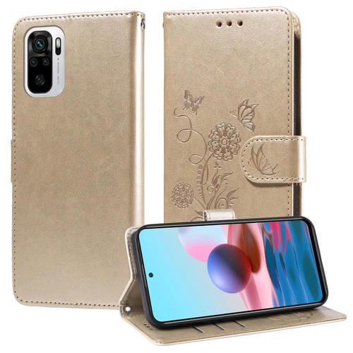 Funda de Cuero con Diseño de Mariposas y Flores En Relieve para Redmi Note 10 4G India/10S 4G (Dorada)