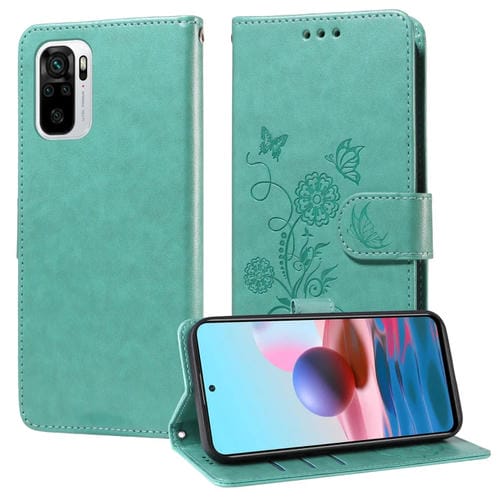 Funda de Cuero con Diseño de Mariposas y Flores En Relieve para Redmi Note 10 4G India/10S 4G (Verde)