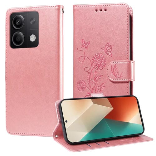 Funda de Cuero con Diseño de Mariposas y Flores En Relieve para Redmi Note 13 5G (Oro Rosa)