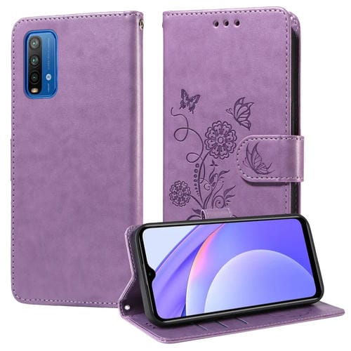 Funda de Cuero con Diseño de Mariposas y Flores En Relieve para Redmi Note 9 4G/10X 4G (Morado)