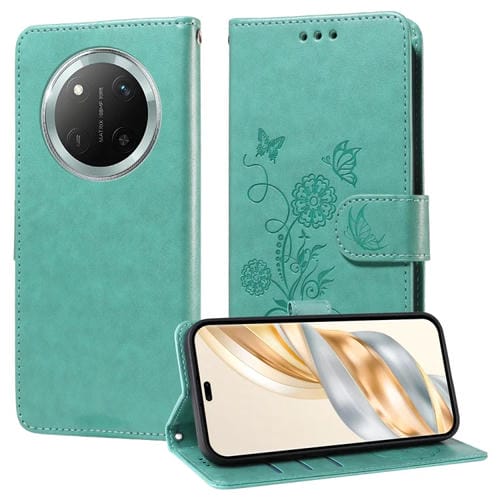 Funda de Cuero para Honor X9C y Magic7 Lite con Diseño de Mariposas y Flores en Relieve (Verde)