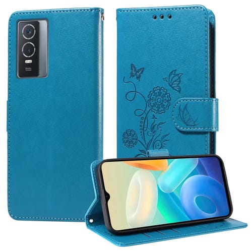 Funda de Cuero con Diseño de Mariposas y Flores En Relieve para Vivo Y76 5G/Y76S (Azul)