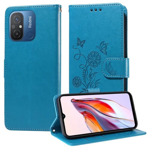 Funda de Cuero con Diseño de Mariposas y Flores En Relieve para Xiaomi Poco C55/Redmi 11A 4G (Azul)