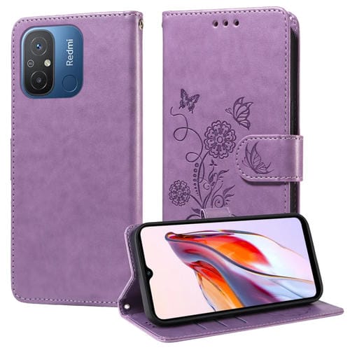 Funda de Cuero con Diseño de Mariposas y Flores En Relieve para Xiaomi Poco C55/Redmi 11A 4G (Morado)