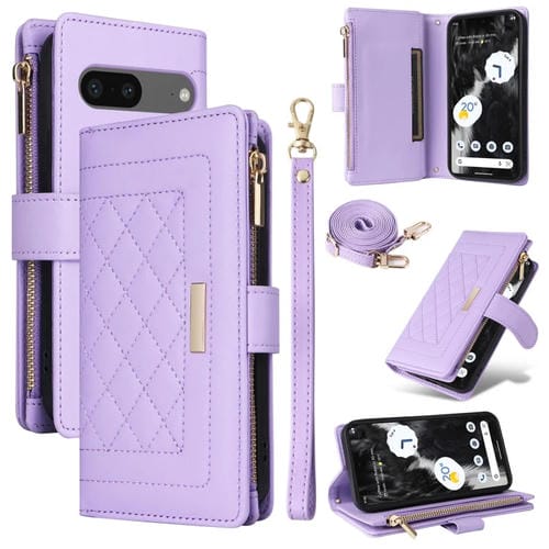 Funda de Cuero con Diseño de Rombos y Billetera Cruzada con Cremallera para Google Pixel 7 (Morado)