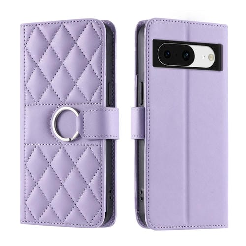 Funda de Cuero Google Pixel 8 con Diseño Rombal y Hebilla de Anillo (Morado)
