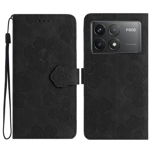 Funda de Cuero con Estampado de Flores En Relieve para Xiaomi Poco F6 Pro (Negra)