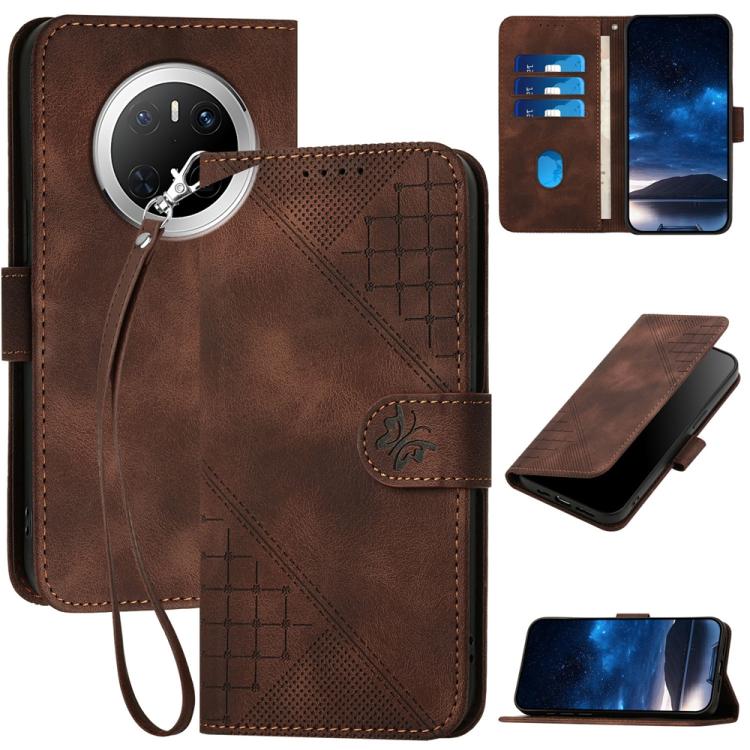 Funda de Cuero para Huawei Mate 70 con Estampado de Mariposas en Relieve y Cordón (Café)