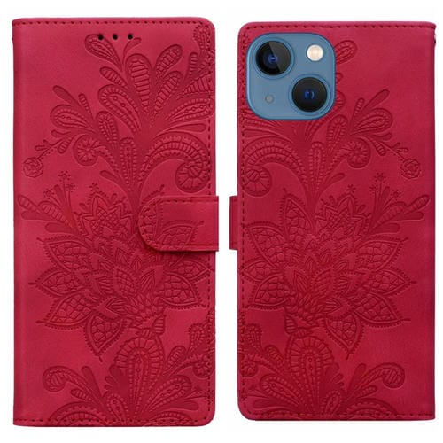 Funda de Cuero para iPhone 13/14 con Hebilla Magnética y Diseño Floral En Relieve (Rojo)
