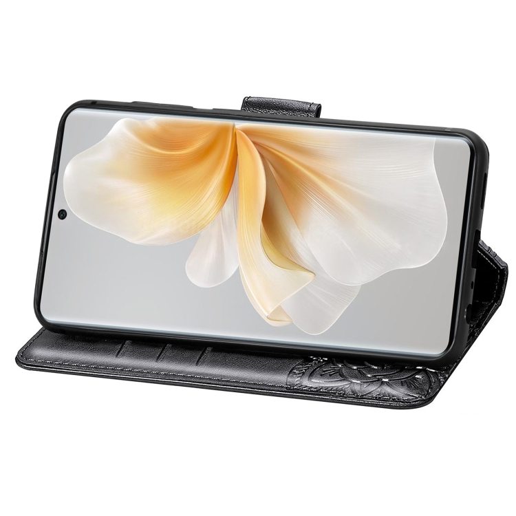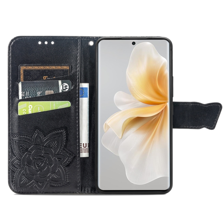 Funda de Cuero con Relieve Mariposa y Flor para TCL 50 5G (Negra)
