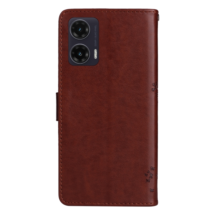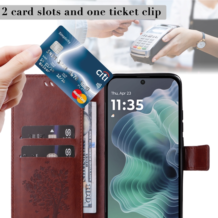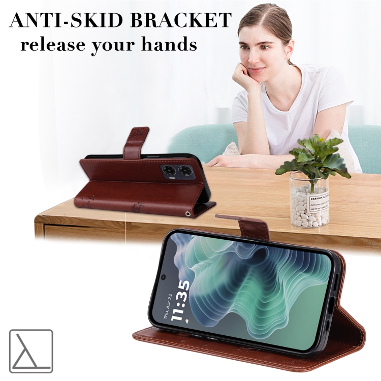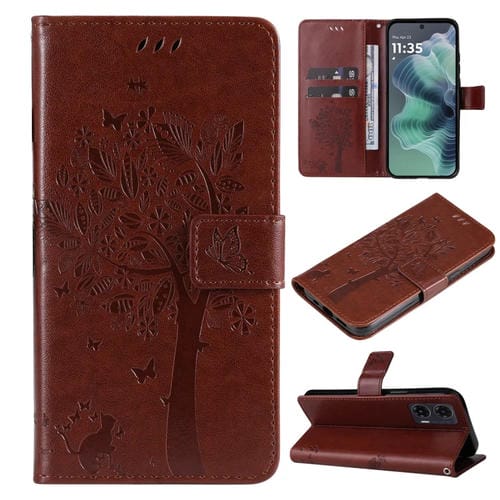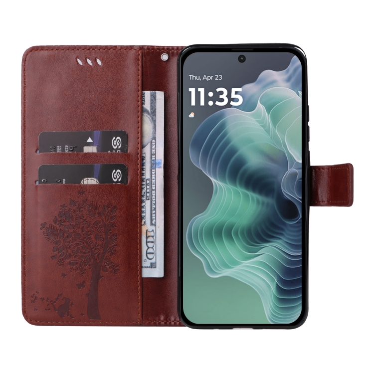 Funda de Cuero con Tapa para Motorola Moto G35 con Diseño de Árbol y Gato (Café)