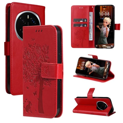 Funda de Cuero con Tapa para Honor Magic7 Pro con Diseño de Árbol y Gato en Relieve (Roja)