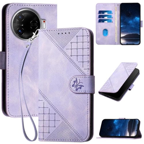 Funda de Cuero con Tapa para Teléfono Tecno Camon 30 Pro 5G Yx0080 Diseño Mariposa Cuadrícula Cordón (Morado Claro)